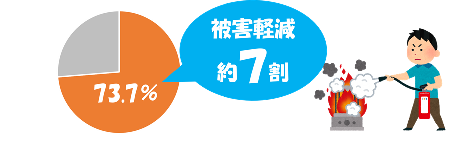 万が一、火災が発生しても消火器具を使用した場合は、約7割が被害軽減につながっています。