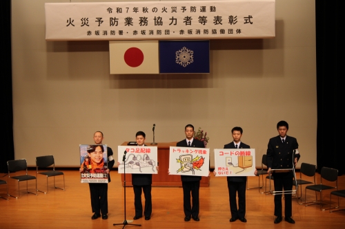 令和7年11月11日(火)に赤坂区民ホールにおいて、「火災予防業務協力者等表彰式」を実施しました。26団体、個人24名の受賞者の皆様、おめでとうございます。