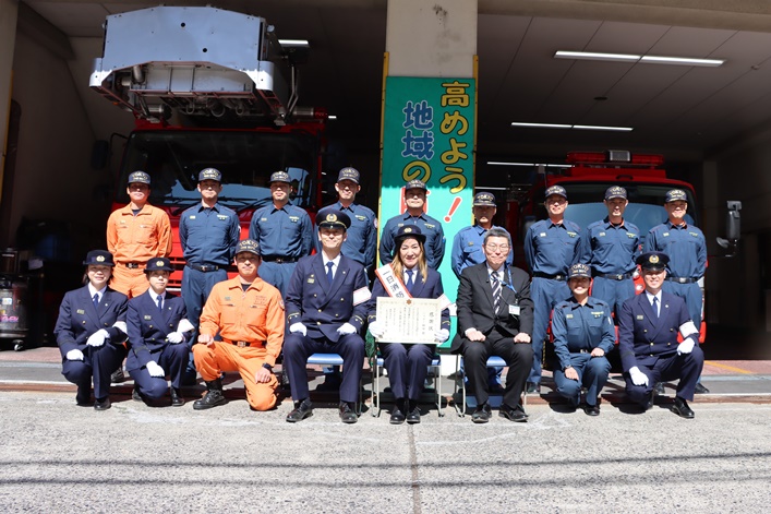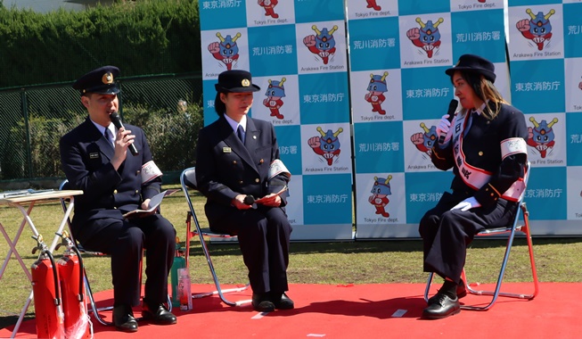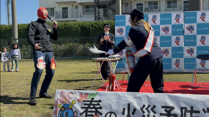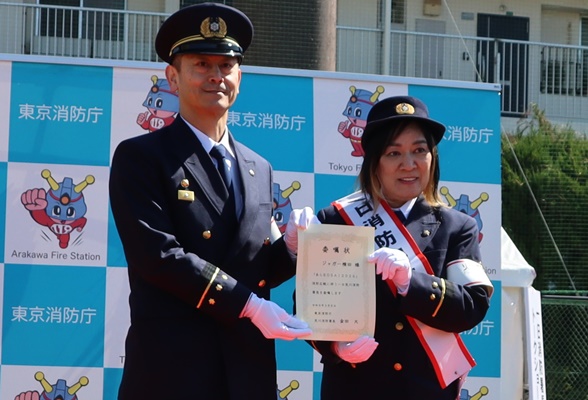 令和8年3月8日(日)、一日消防署長を務めていただいたジャガー横田様に署長感謝状を贈呈しました。荒川区の南千住野球場で開催された「あらBOSAI2026」に一日消防署長として出演し、会場を訪れた4,000人を超える観客に防火防災を呼びかけていただきました。トークショーでは、火災予防や東日本大震災発生時のお話をしていただいたり、突如として現れた悪役レスラー「ファイヤーデビル」をリングさながらの迫力で一喝し、消火器で見事に撃退したりして、会場を盛り上げてくださいました。