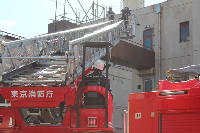 11月21日(金)に深川消防署の裏庭にて、はしご隊及び指揮隊が日頃の訓練成果を発揮した。はしご隊の迫力のある放水と40mの長さを活かした救出、そして指揮隊の的確な判断や統率力で、マンションのベランダに取り残された要救助者3名を、無事に救出した!!