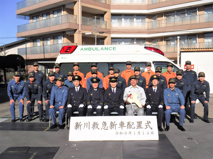 令和8年1月14日(水)、東久留米消防署新川出張所に新しい救急車が配置されたため、新車配置式を行いました。今回導入された車両は、車両側面に隊名が表示されたり、活動状況に応じて赤色蛍光灯の発光パターンが変化するLED式赤色灯を採用するなど、様々な機能を搭載しております。