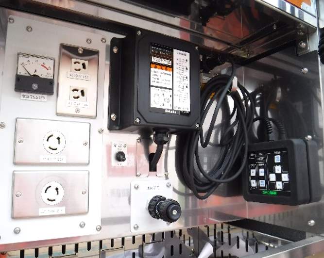 車両右ボックス内に収納されており、昇降式照明装置や電気ハンマードリル等の救助器具への電力供給のため定格出力7.5KVAの電力を確保しています。