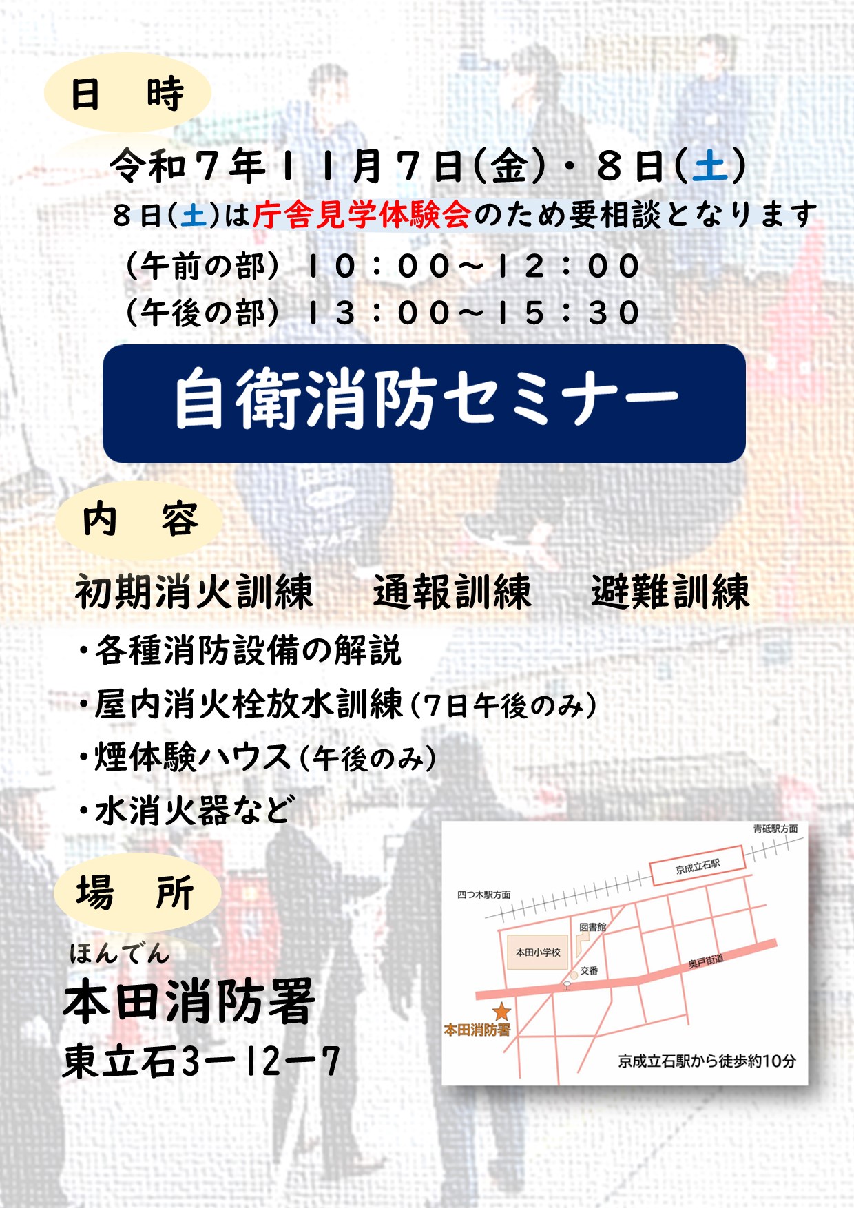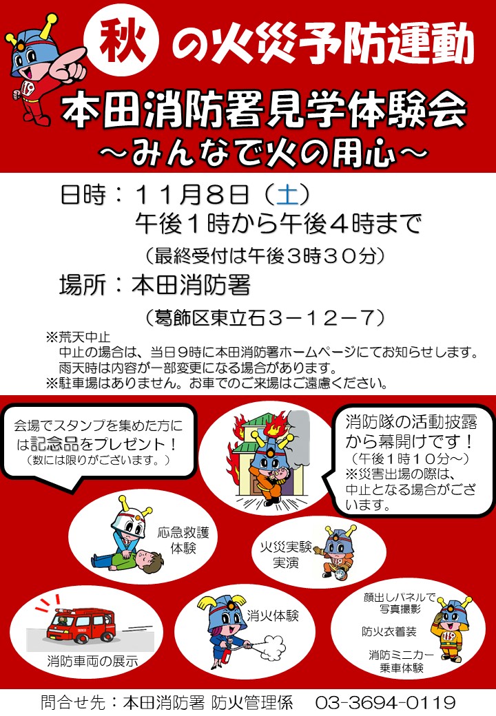 日時:11月8日(土)午後1:00から午後4時00まで場所:本田消防署(葛飾区東立石三丁目12番7号)