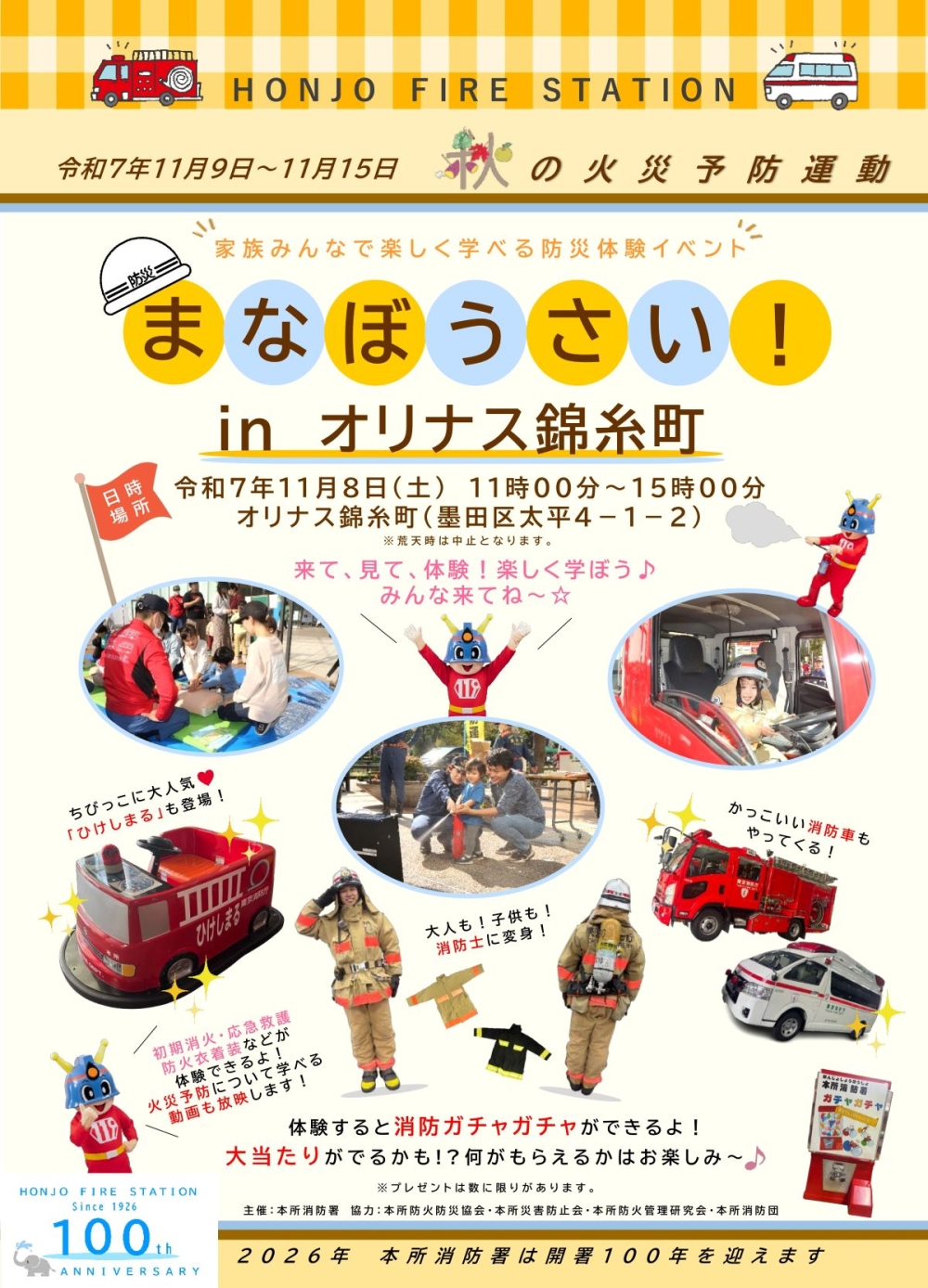本所消防署では、令和7年秋の火災予防運動に伴い、「まなぼうさい!inオリナス錦糸町」を開催します。