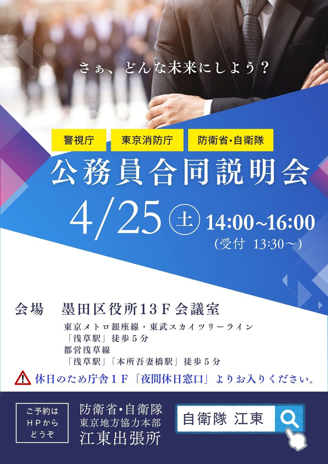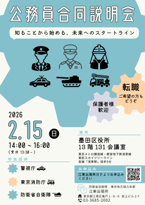 自衛隊東京地方協力本部(江東出張所)主催による、警視庁・東京消防庁・自衛隊の公務員合同説明会を開催します。