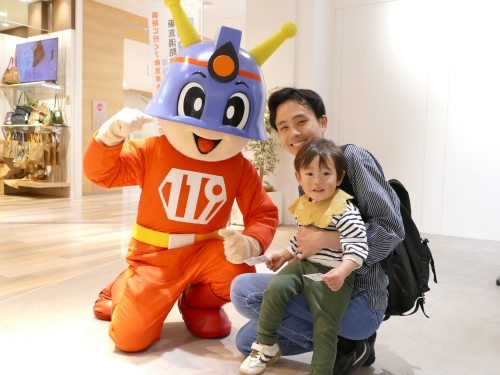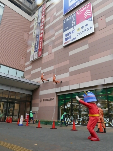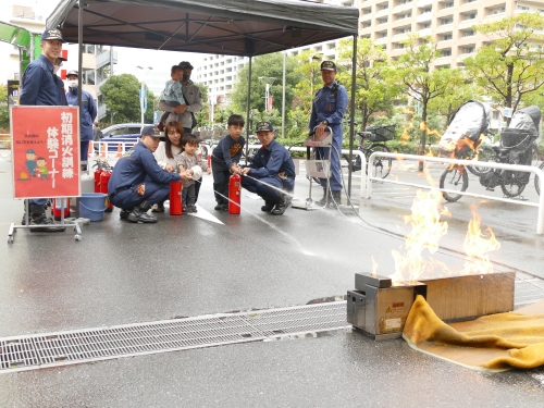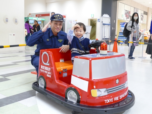11月9日(日)南砂町ショッピングセンターSUNAMO(江東区新砂三丁目4番31号)で、『城東消防フェアinスナモ~見て 知って ふれあい消防体験~』を開催しました。初期消火体験、消防車両展示、AED体験、消防ミニカー乗車体験、ミニ防火衣着装体験、スタンプラリーを実施し、雨天にもかかわらず、約1,500名もの家族連れにご参加いただき、大盛況となりました。また、特別救助隊による座席懸垂で次々に降下する隊員の姿に黄色い声援が飛び交い「毎年、子供が楽しみにしています」と、嬉しい言葉を頂きました。