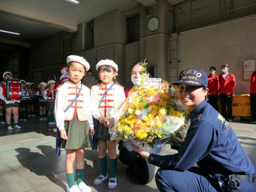 11月27日(木)、地域の安全・安心を守っていることへの感謝として、きよし幼稚園の園児100名から鼓笛演奏と花束を頂きました。園児たちから、「きらきら星」や「ミッキーマウス・マーチ」など全5曲を元気よく披露され、心温まるひとときとなりました。