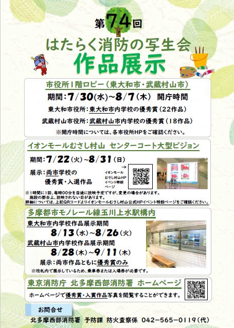 北多摩西部消防署管内の東大和市・武蔵村山市からは計18校から約1,700名の児童、生徒が参加してくれ、思い思いの作品を力強く描いてくれました。下記日程で展示会を行いますので、この機会にぜひご覧ください!