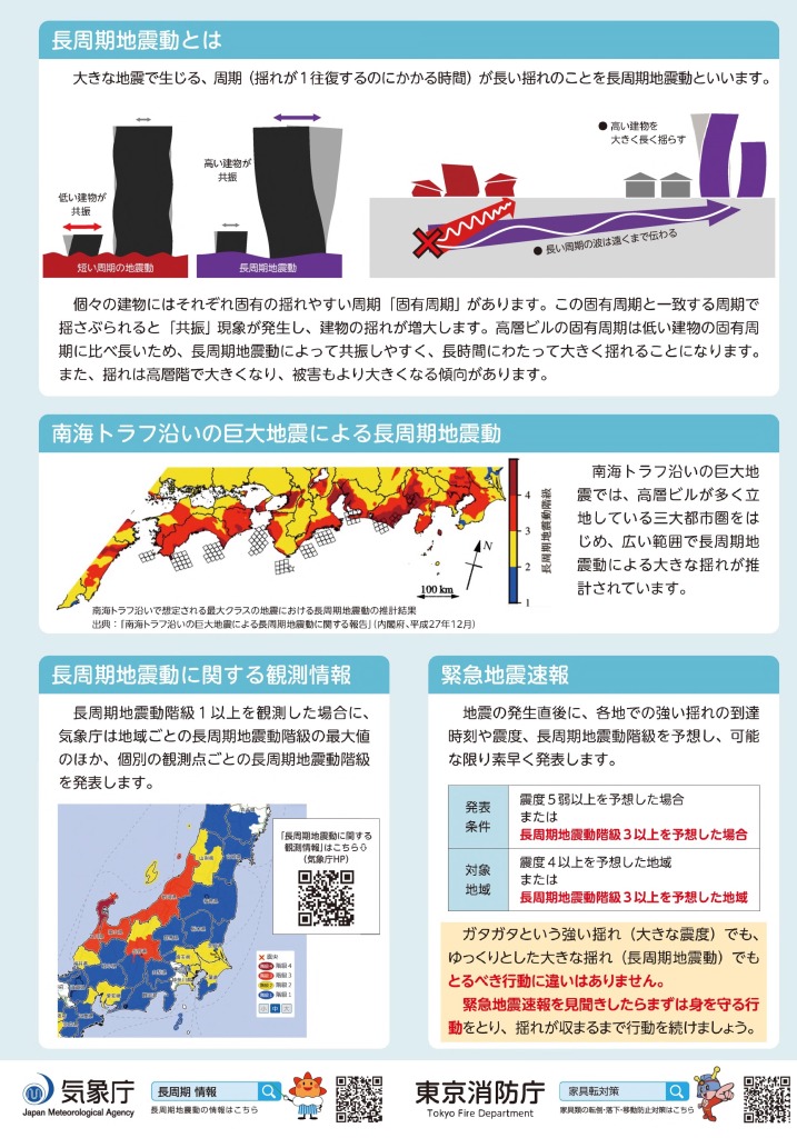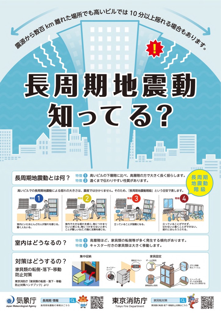 大きな地震が発生すると、震源地が遠くても長周期地震動による被害が都内で発生する場合があります。高いビルの高層階では家具や家電製品の転倒・落下に加え、それらが大きく移動することによるケガ、避難路の閉塞や、窓ガラスを破って地上に落下する等の危険性が考えられます。家具転倒対策の必要性や方法を学んで、あなたや大切な人を守るために家具転対策を実施しましょう!