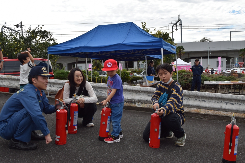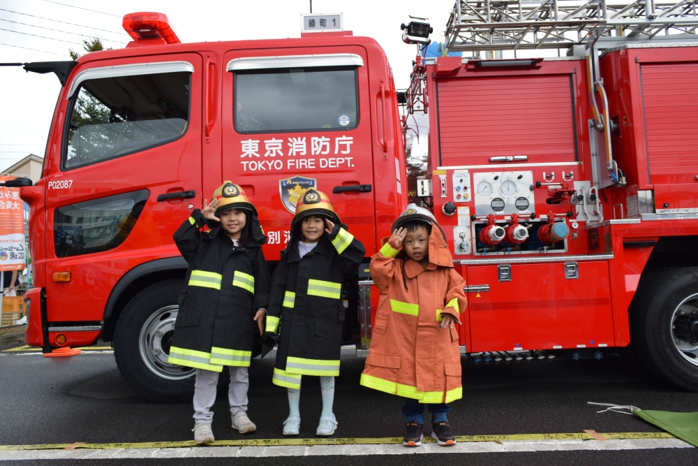 令和7年10月19日(日)、小金井自動車学校で開催されたフリーマーケットに出展しました。当日は地域の方々が多数来場され、模擬消火器での消火体験や、クイズコーナーなど、約600名に参加していただき、多くの皆様に防火防災について関心を持って頂く機会となりました。なかでもミニ防火衣着装体験は一番人気があり、たくさんの小さな消防士たちが現われ、可愛い「敬礼!」を見ることができました。