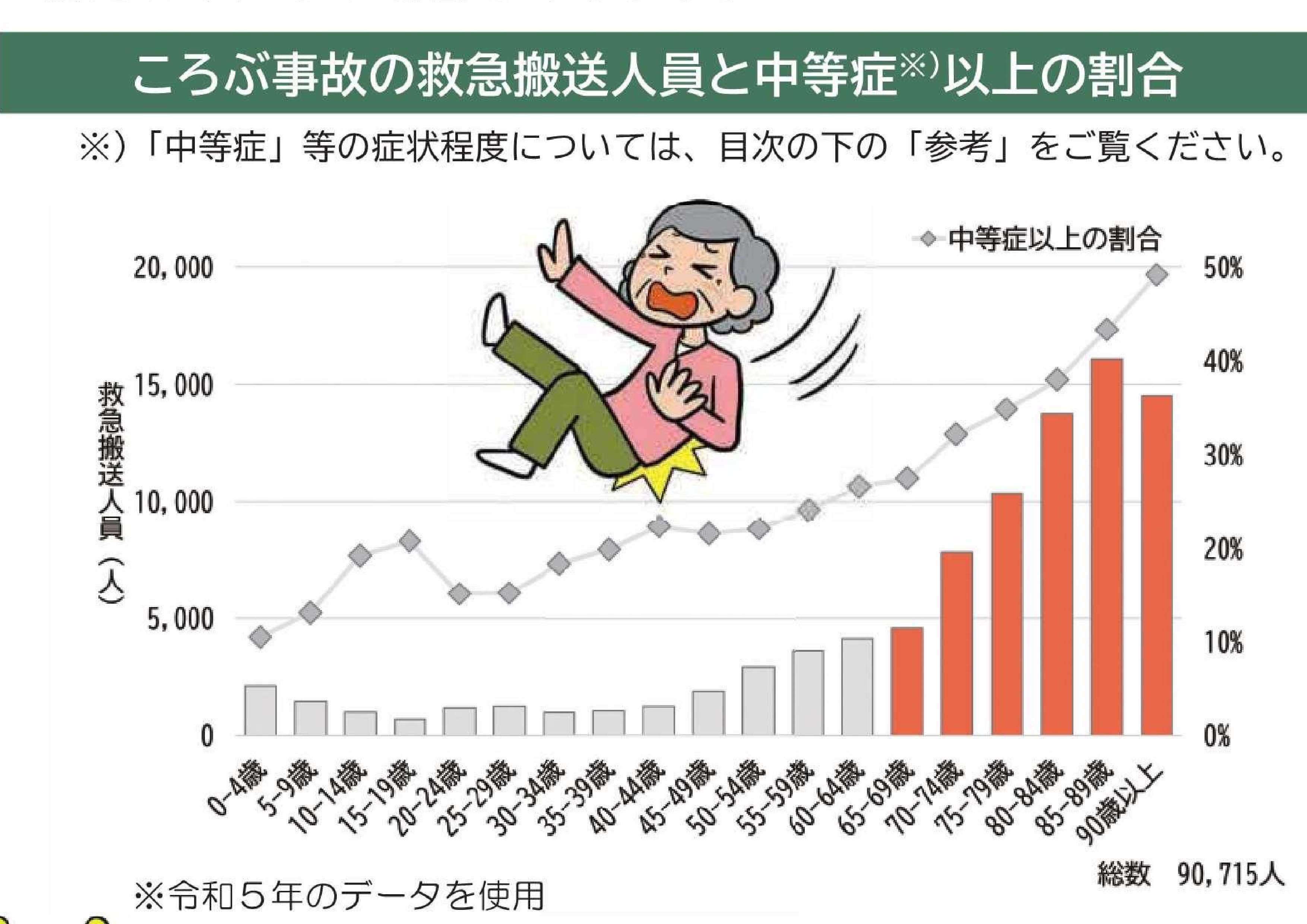 「ころぶ」事故により年間10万人(東京消防庁管内)が救急搬送されていて、そのうちの7割以上が高齢者となっています。