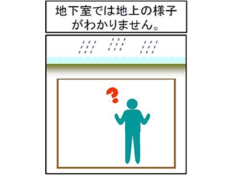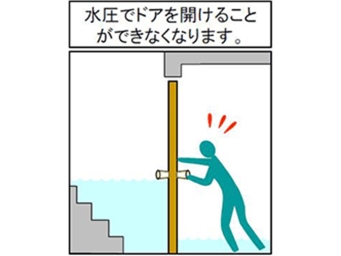 ・地下室にいる場合は、水圧でドアが開かず脱出できなくなる恐れや地下に流入する水の勢いで避難ができなくなる恐れがありますので、早期に避難する必要があります。