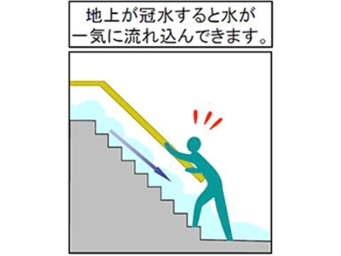 地上の浸水は浅い場合でも、地下空間では水位が出入口等の高さを超えると一気に浸水が始まり、短時間で水位が上昇するなど、地上と異なる危険性があります。