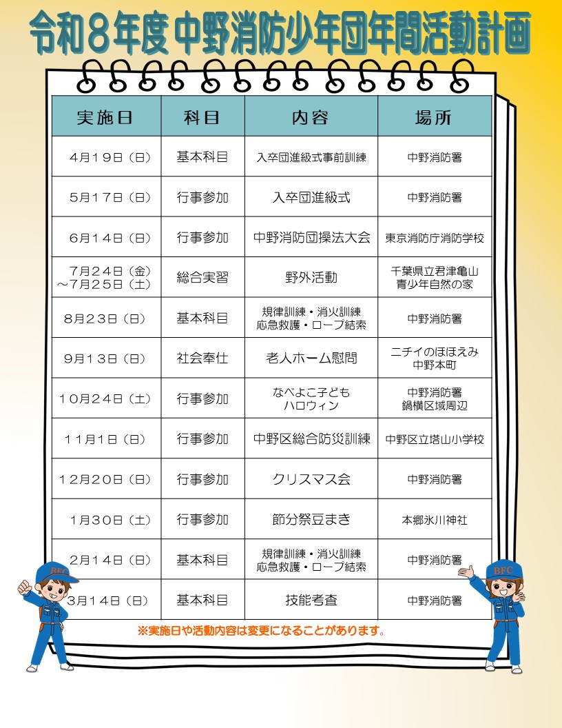 中野消防少年団は、萩原消防少年団長を中心に、消防の仕事や火災予防に関心のある小学1年生から高校3年生の少年少女と消防少年団の活動を支援する指導者・準指導者で結成されています。