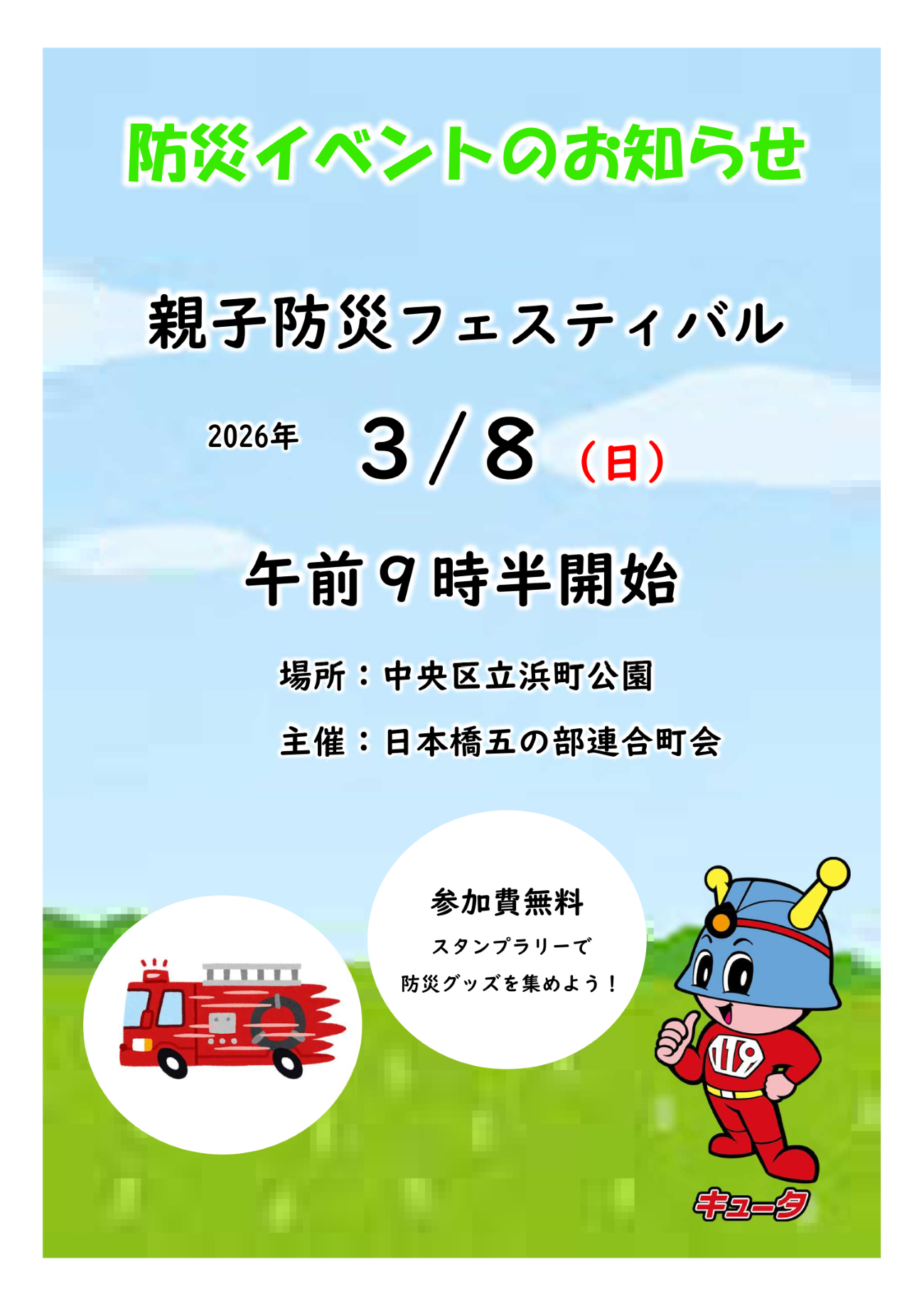 当日は起震車による地震体験や初期消火体験のほか、キュータも登場予定です。