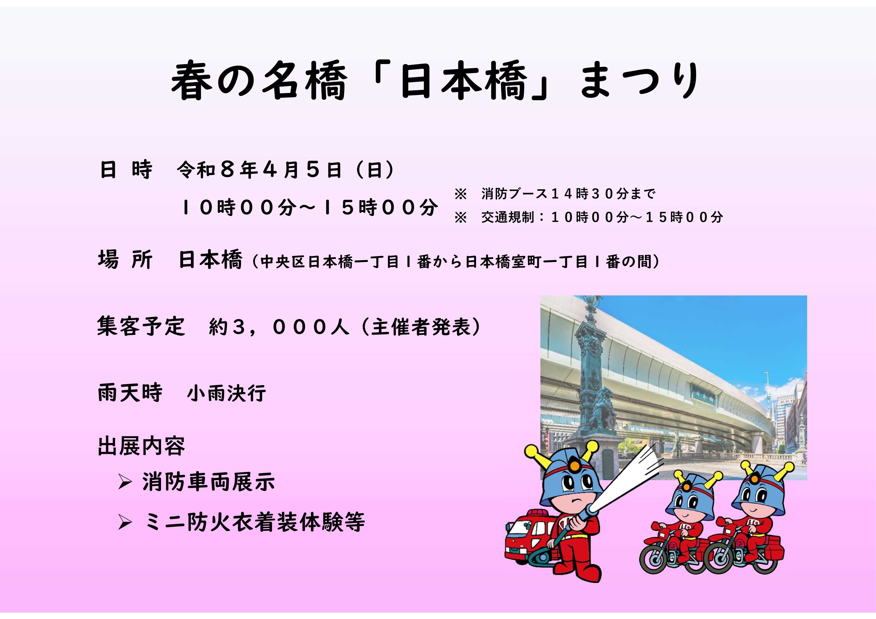 小雨決行(当日の実施有無については、当日9時00分に日本橋消防署ホームページでお知らせします。)