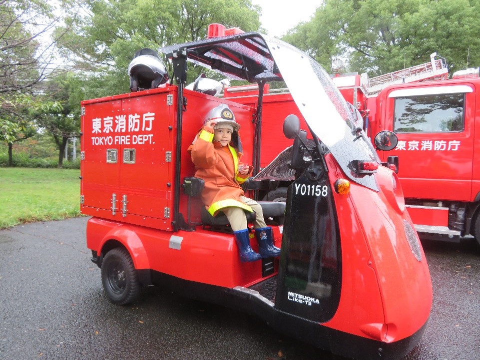 あいにくの雨でしたが、多くの家族連れの方に参加いただき、当庁でも数台しかない電動トライクの展示や各コーナーでの体験を楽しむ姿が見られ、消防や防災について考えてもらう良いきっかけとなりました。
