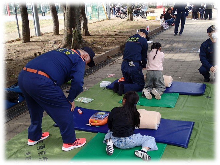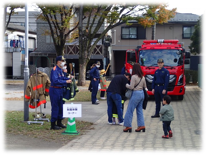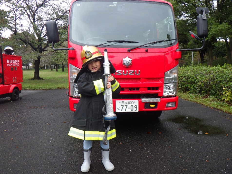 10月25日(土)に舎人公園において「舎人公園 防災フェスタ」が実施されました。消防団員と共に、応急救護訓練や電動トライクの展示、ミニ防火衣を着ての写真撮影等を実施しました。