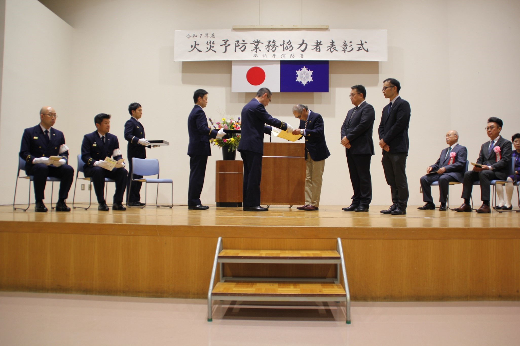 火災予防業務において、日頃から消防行政にご協力いただいている町会、事業者、個人の方々等に対し、西新井消防署長から感謝状と表彰状をお渡ししました。