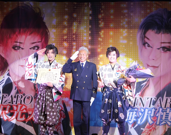 舞台上の華やかな雰囲気の中、多くの観客の皆様の前で河本消防署長から梅沢慎太郎さん、梅沢光太郎さんに感謝状と花束が手渡されると、会場は大きな拍手に包まれました。