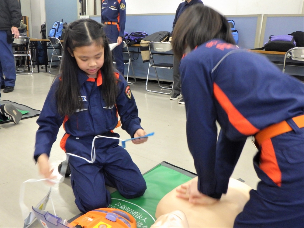 (写真2)…救急章1級の取得に向けて、応急救護訓練を行いました。高校生団員から指導を受け、胸骨圧迫やAEDの正しい使い方を覚えました。