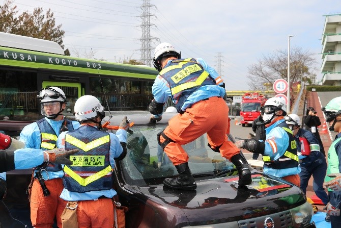 訓練は、志村消防署管内の幹線道路で路線バスと乗用車が衝突し、歩行者の重傷者、乗用車内の要救助者及びバス車内に多数のけが人が発生した想定で、板橋・練馬区内の消防隊25隊をはじめ、志村消防団、帝京大学医学部付属病院東京DMAT、高島平警察及び板橋区役所が参加し、連携した訓練が行われました。
