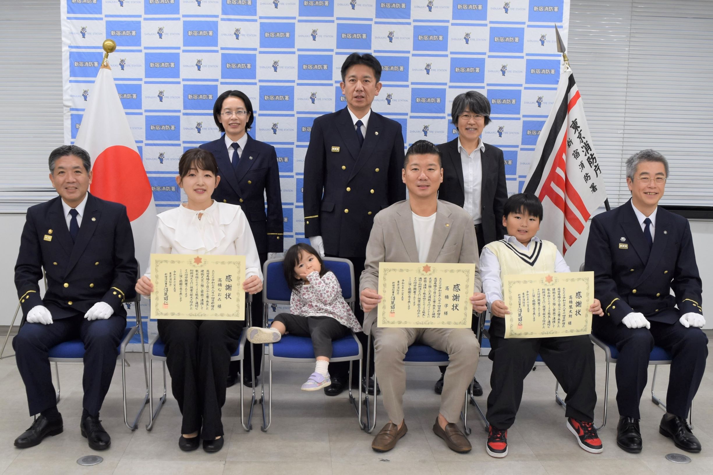 本件は、地下1階の飲食店から火災が発生し、近隣に住むご家族3名が119番通報を行うとともに自宅の散水栓からホースを延長して初期消火を適切に行い、被害の拡大防止に貢献した功労によるものです。