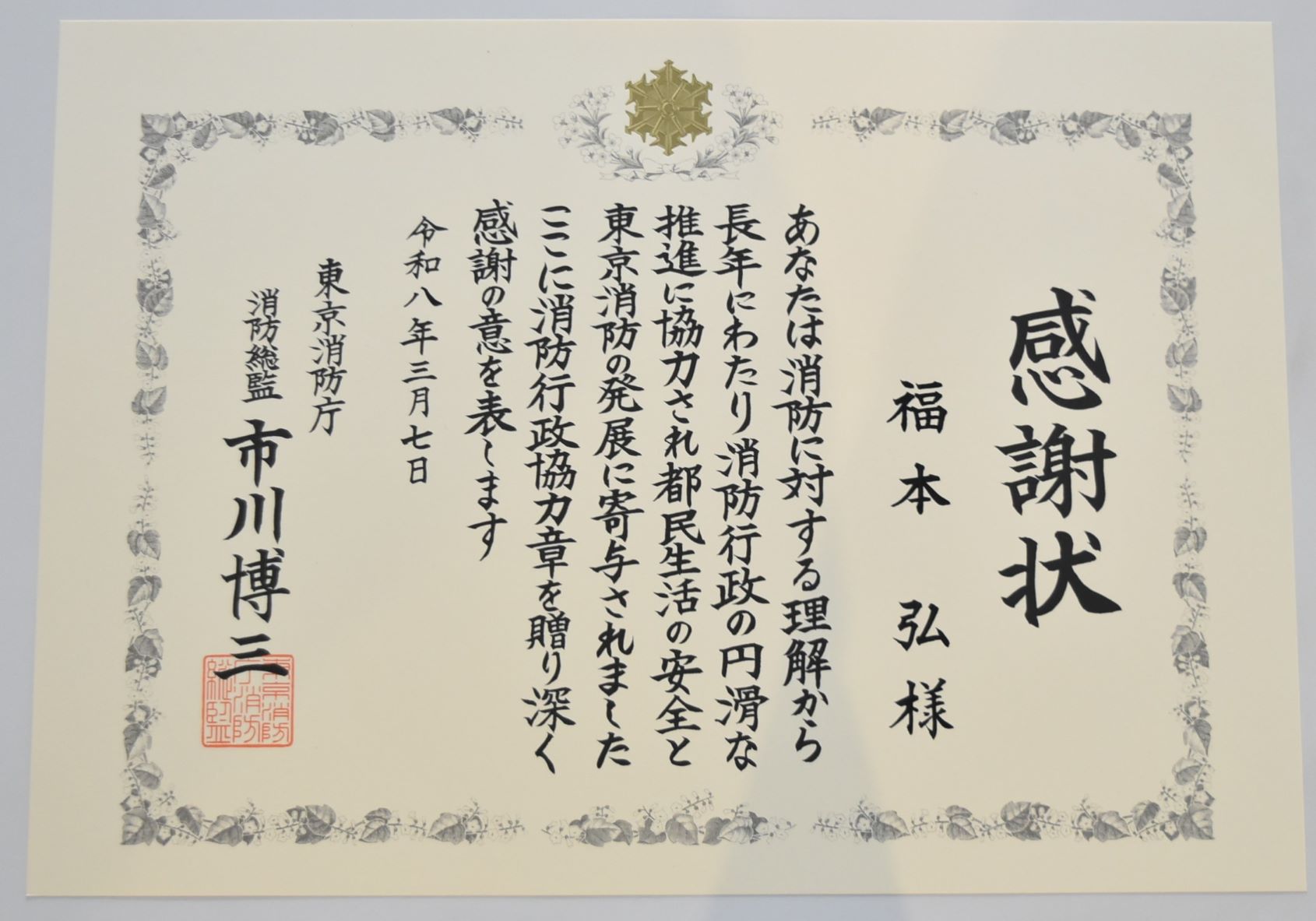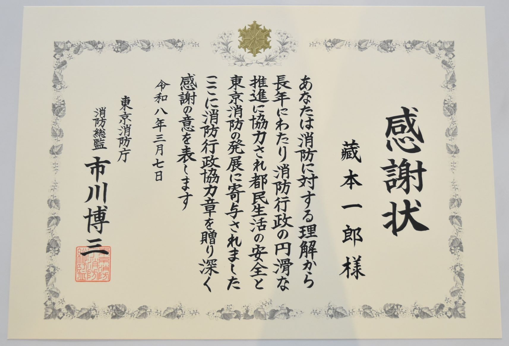 消防総監感謝状を贈呈しました
