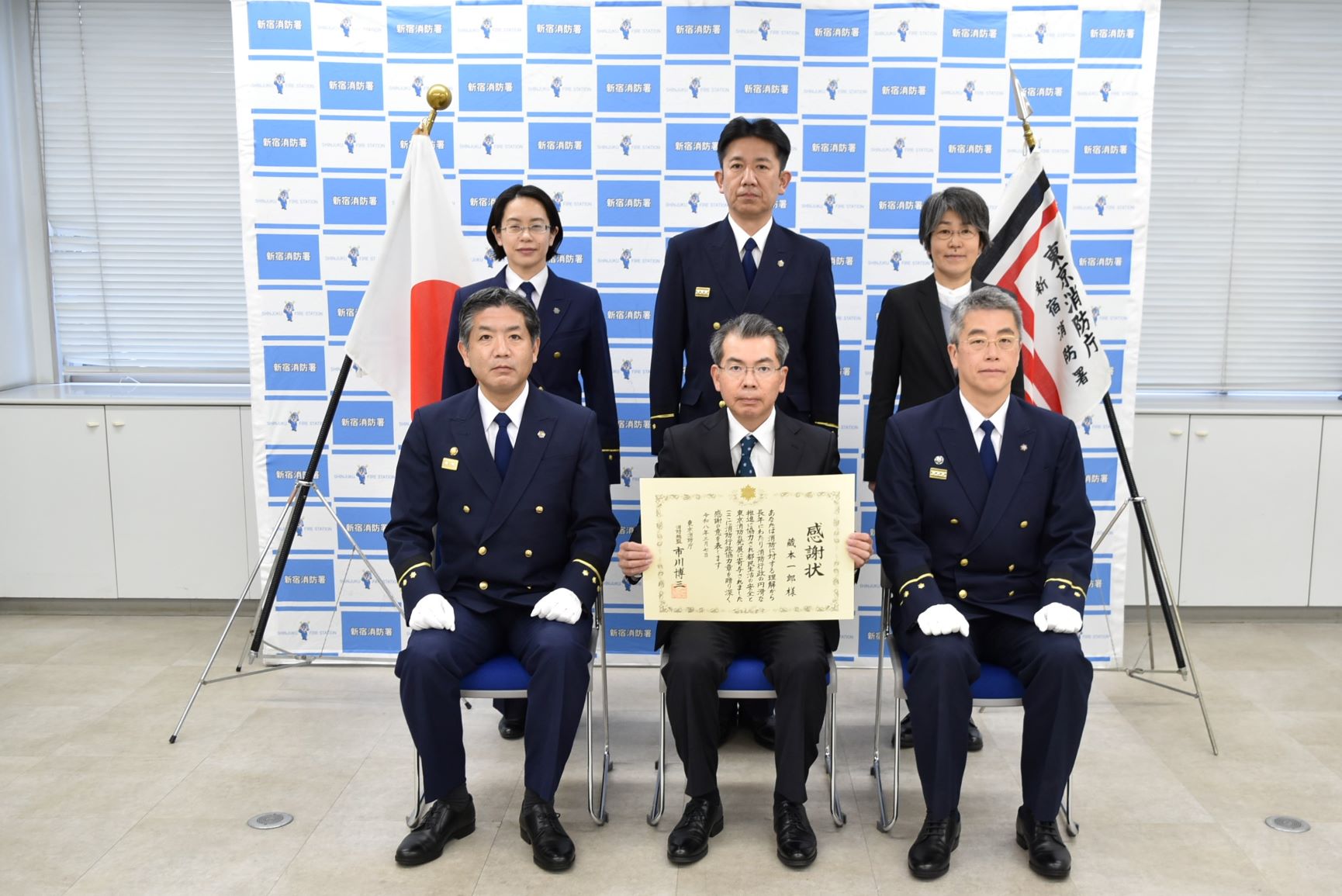 令和8年3月9日(月)、新宿防火防災協会副会長 福本弘様、新宿消防署懇話会理事/市嶋商事株式会社 代表取締役 藏本一郎様が消防行政協力章を受章されました。この章は長年にわたり消防行政の発展や、消防業務の推進等に貢献した方へ贈られるものです。