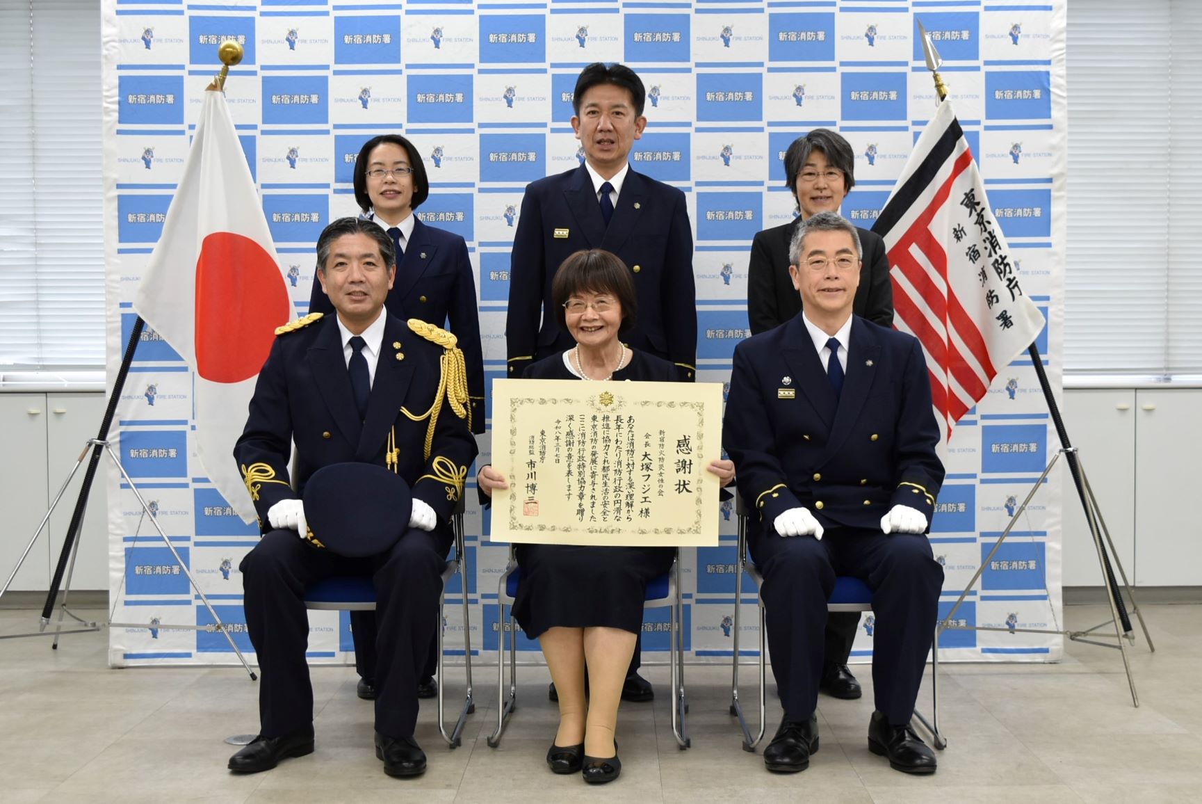 令和8年3月6日(金)、新宿防火防災女性の会会長 大塚フジエ様が消防行政特別協力章を受章されました。この章は長年にわたり消防行政の発展や、消防業務の推進等に貢献した方へ贈られるものです。