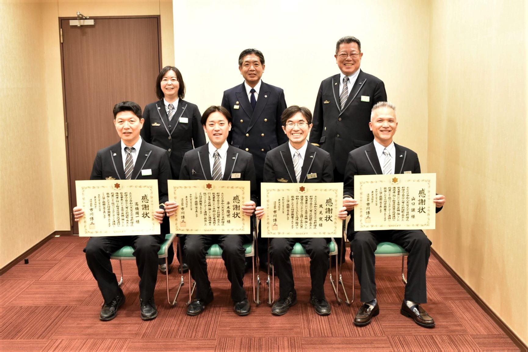 本件は、心肺停止に陥り生命の危機に瀕していた男性に対し、5名が連携し119番通報、胸骨圧迫マッサージ、AEDの使用などの適切な救護活動を実施し救命した功労によるものです。