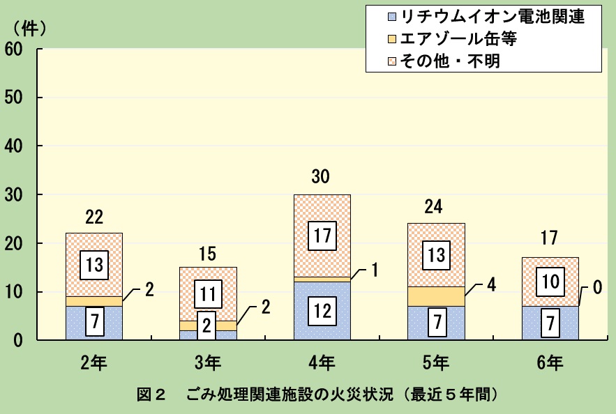 令和6年におけるごみ処理関連施設の火災は17件発生しました。このうち、発火源がリチウムイオン電池関連の火災が最も多く7件発生しています。