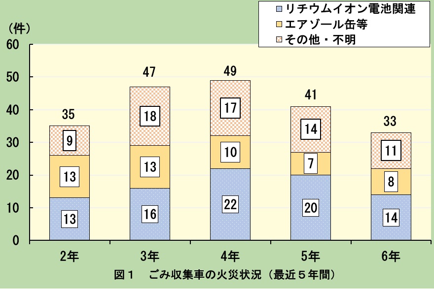 令和6年におけるごみ収集車の火災は33件発生しました。特に、リチウムイオン電池を含む製品が発火源となる火災が増加傾向にあります。令和6年は発火源がリチウムイオン電池関連の火災が最も多く14件発生し、次いでエアゾール缶等の火災が8件発生しています。