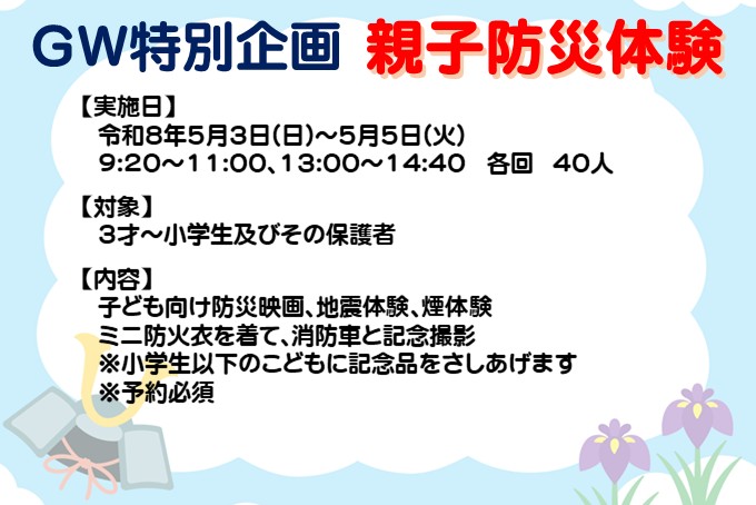 | 令和8年03月06日 | ゴールデンウィーク特別企画 親子防災体験 |