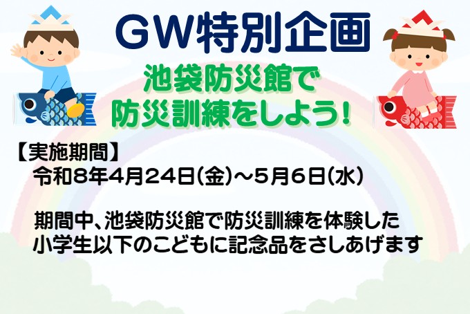 | 令和8年03月06日 | ゴールデンウィーク特別企画 池袋防災館で防災訓練をしよう! |