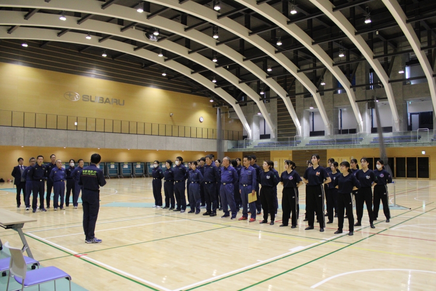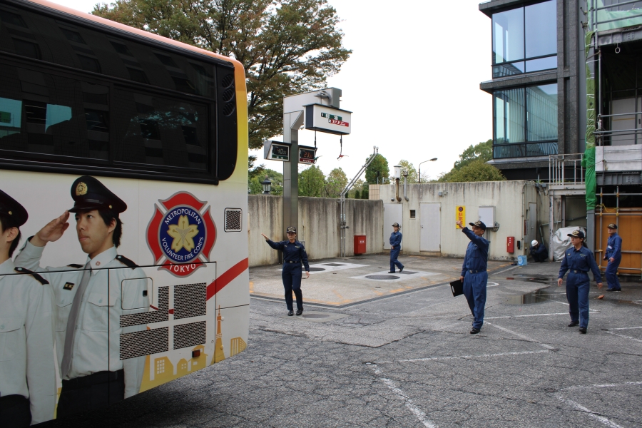 大型バスでの移動が多いので年にこうして定期的に隊員同士で大型バスの車両誘導訓練を実施しています。